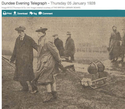 This photo in the Dundee Evening Telegraph is captioned, "Lord Kinnaird of Rossie Priory and his factor, Mr Macdonald, taking their curling equipment to the station by sledge." One has to imagine that it must have become rather muddy! How stones were transported has been discussed before, see here, and the photo shows that Lord Kinnaid and his factor had two stones in separate boxes, and two in baskets.